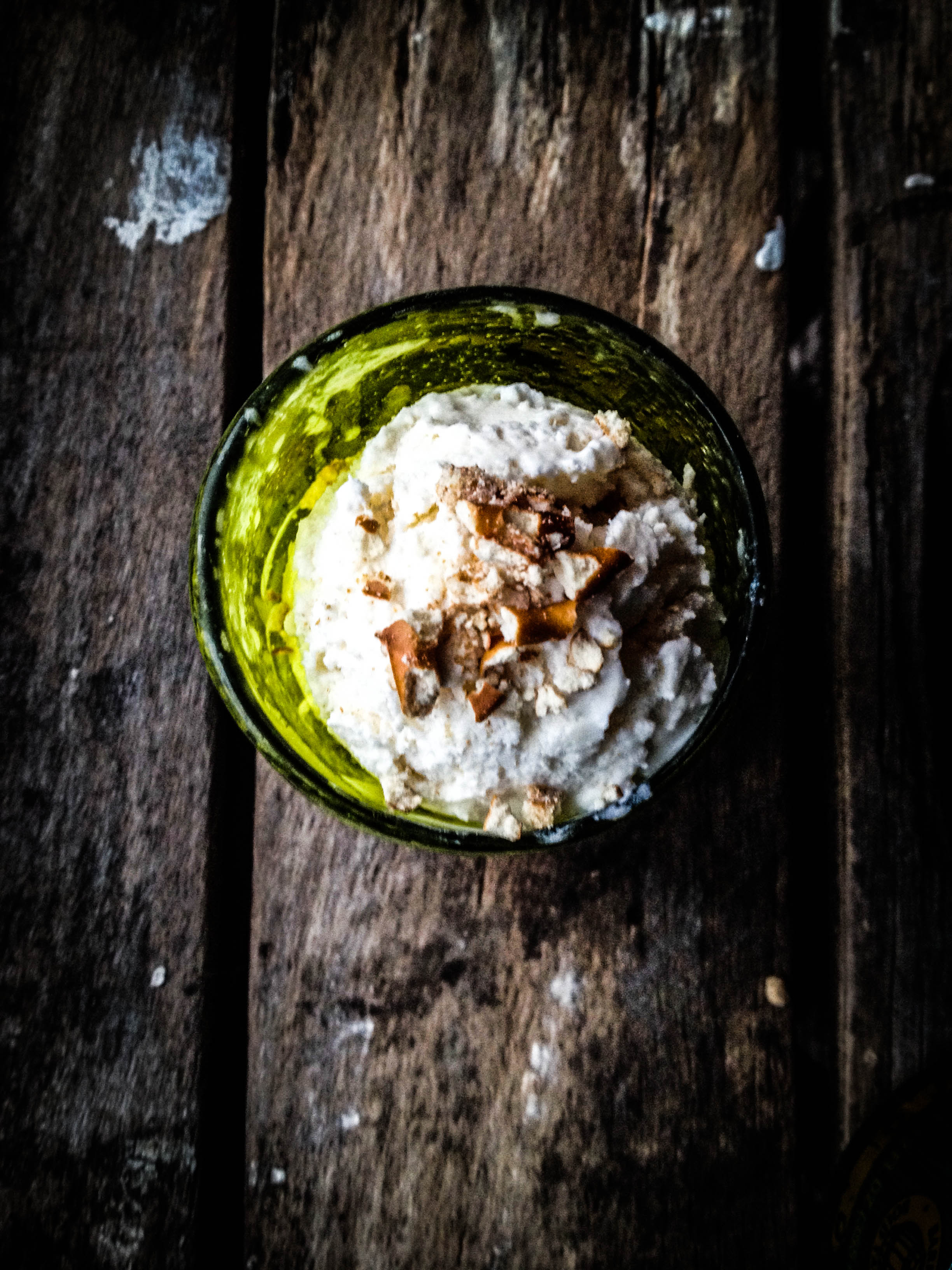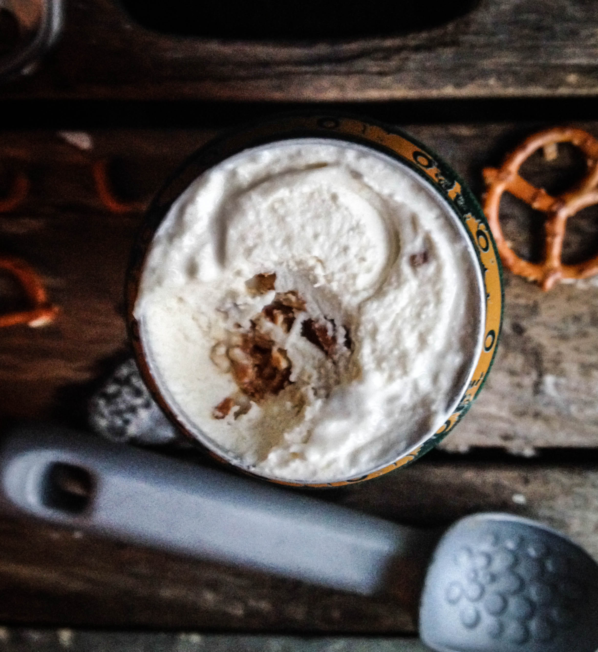 7. Make your ice cream according to the manufacturer’s instructions. Once churned, swirl in the pretzel clumps (I usually use a loaf pan – add one layer of ice cream to the bottom, then a layer of pretzels, and top with a final layer of ice cream. When you scoop, it will leave a swirled effect!)