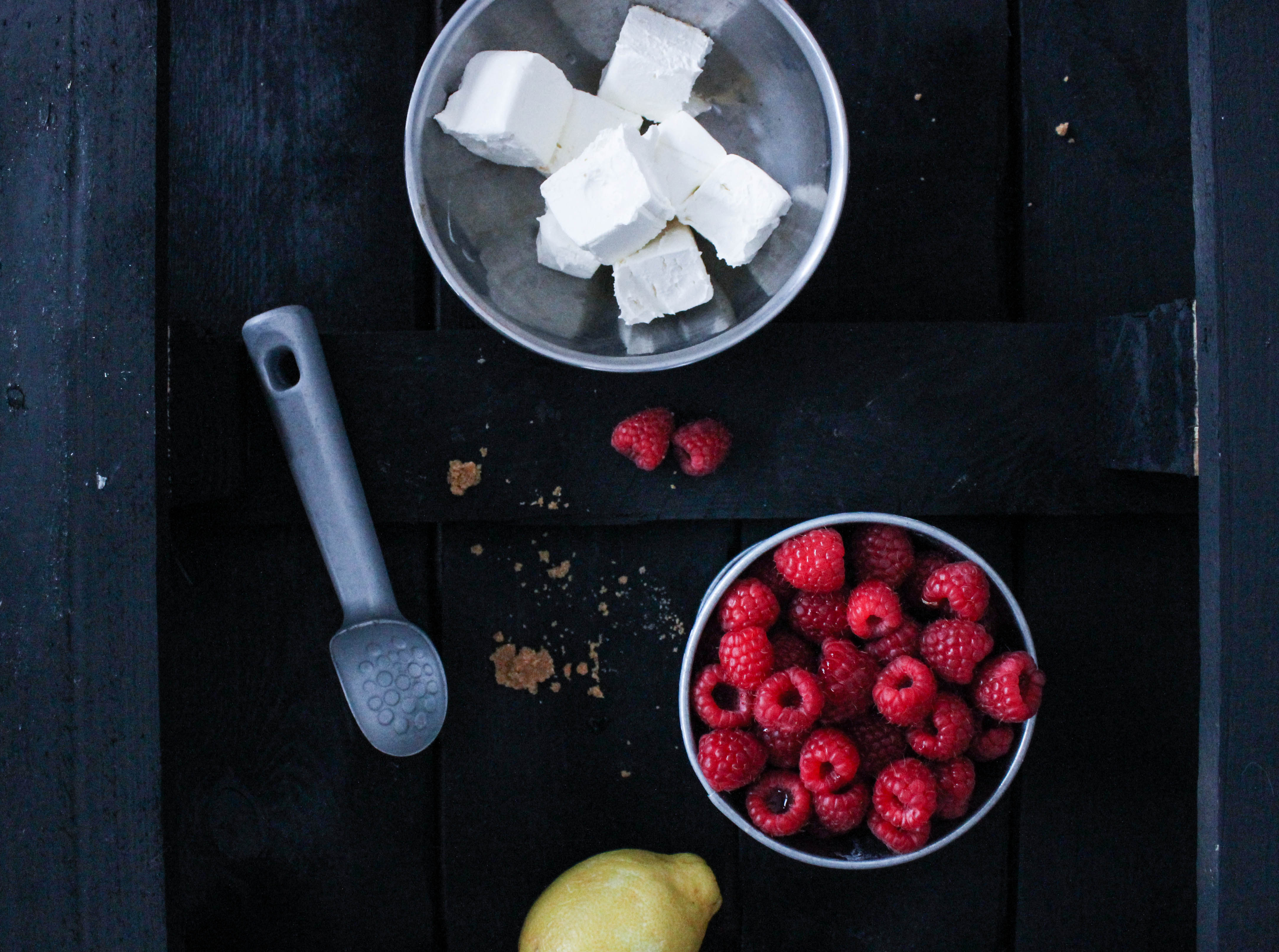 1. Add the cream cheese, sugar, sour cream, half and half, and salt to a blender. Zest 2/3 of the lemon straight into the machine, saving the rest for later