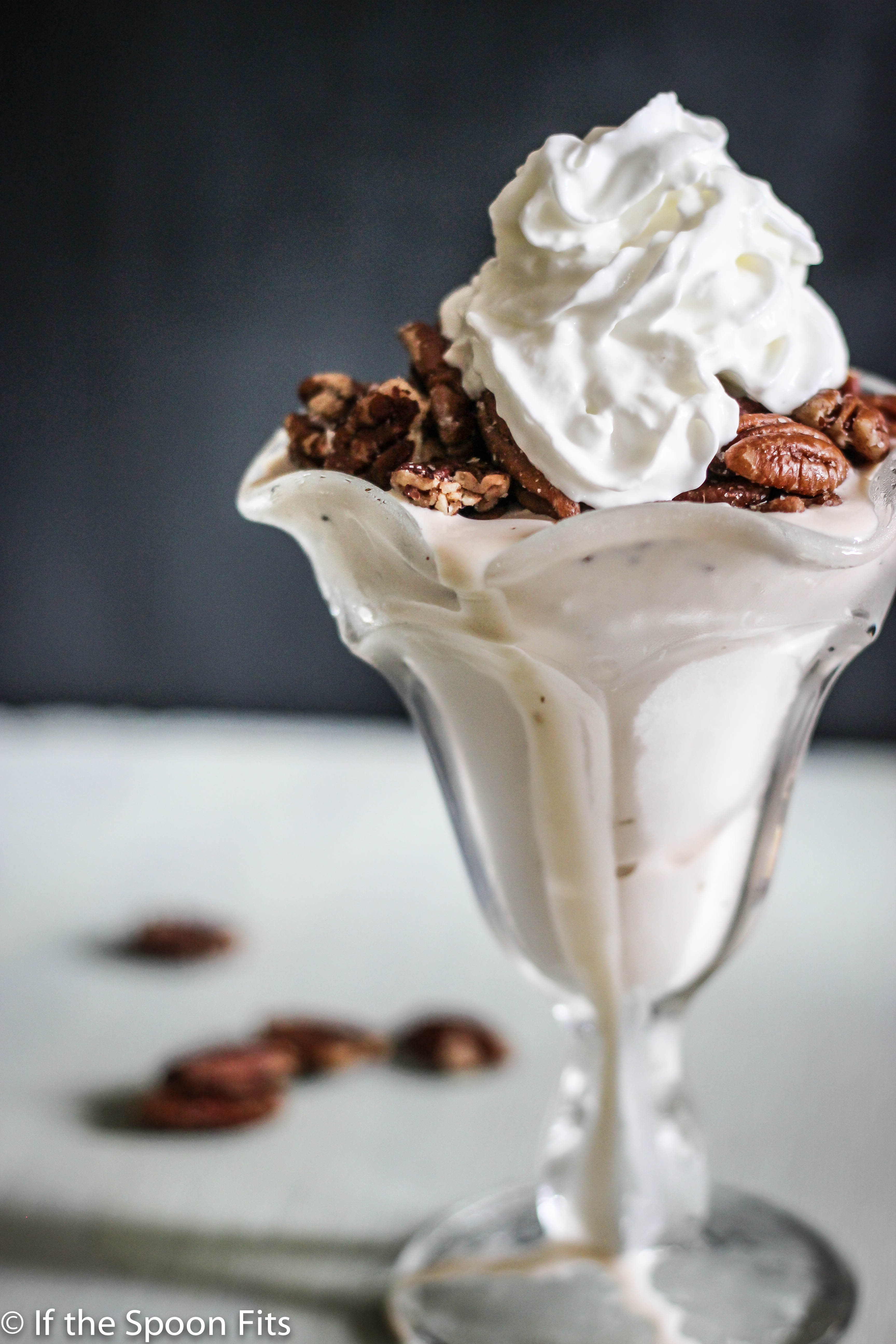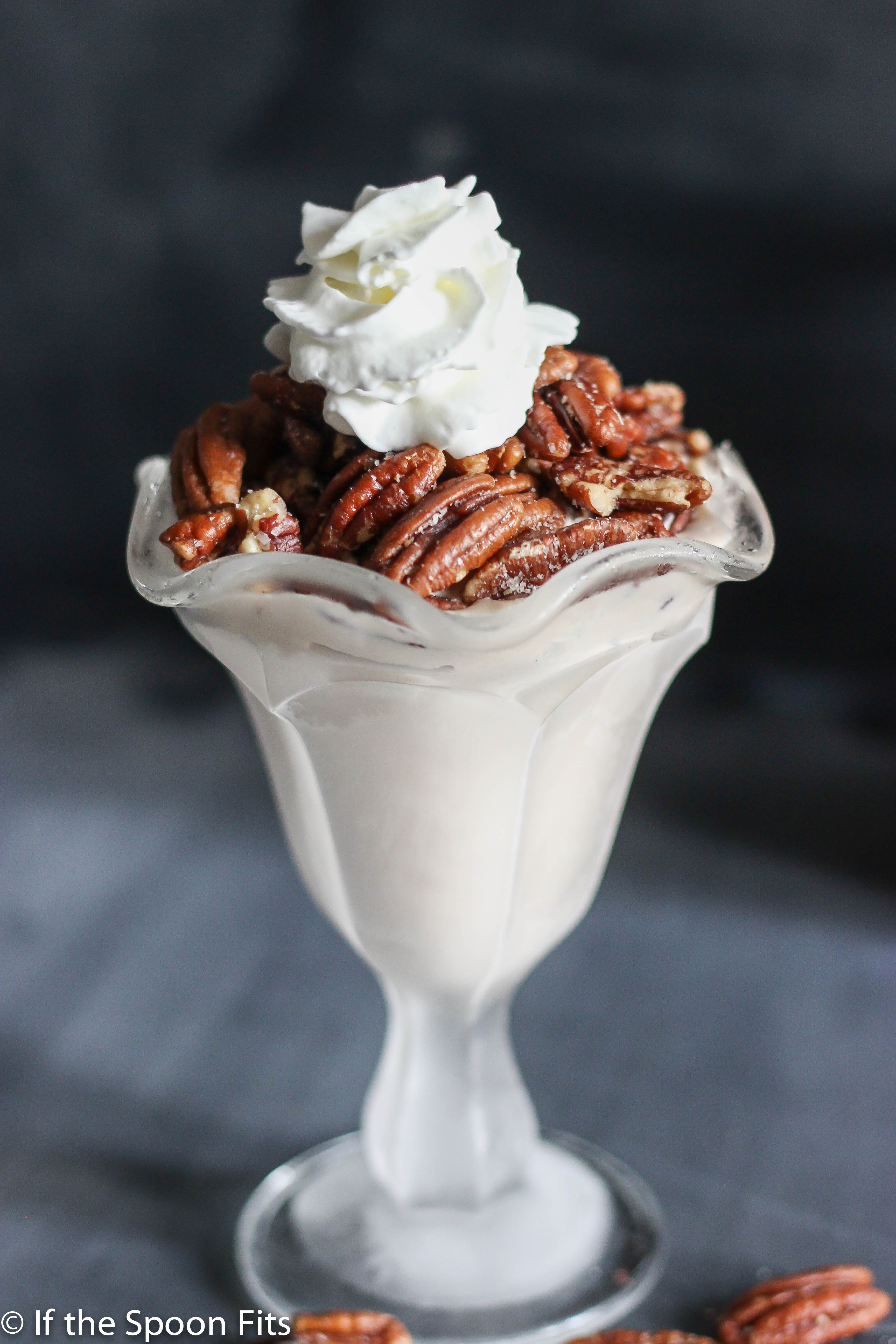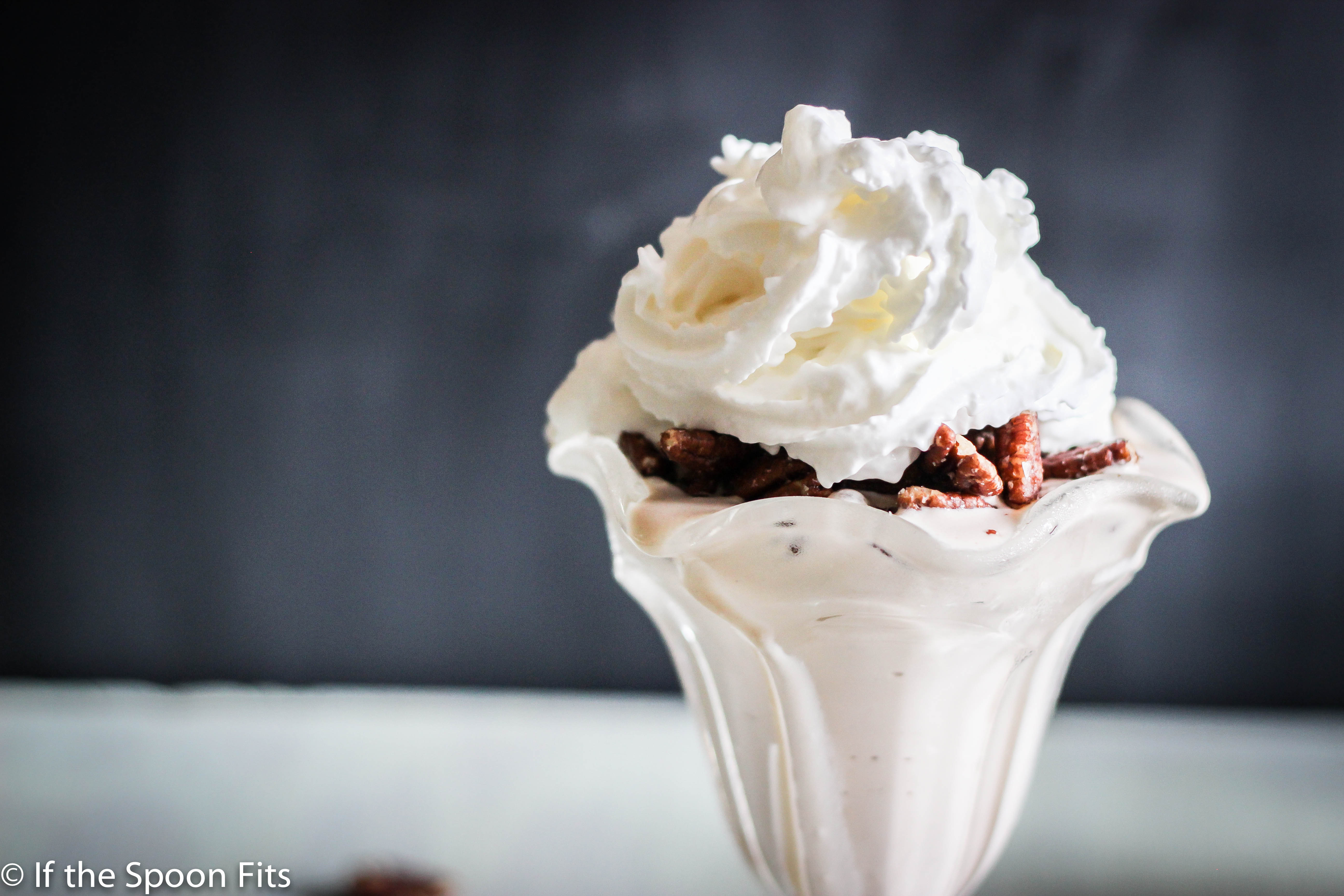 - Pour softened ice cream into a chilled glass. Top with salted pecans and whipped cream. Serve immediately.