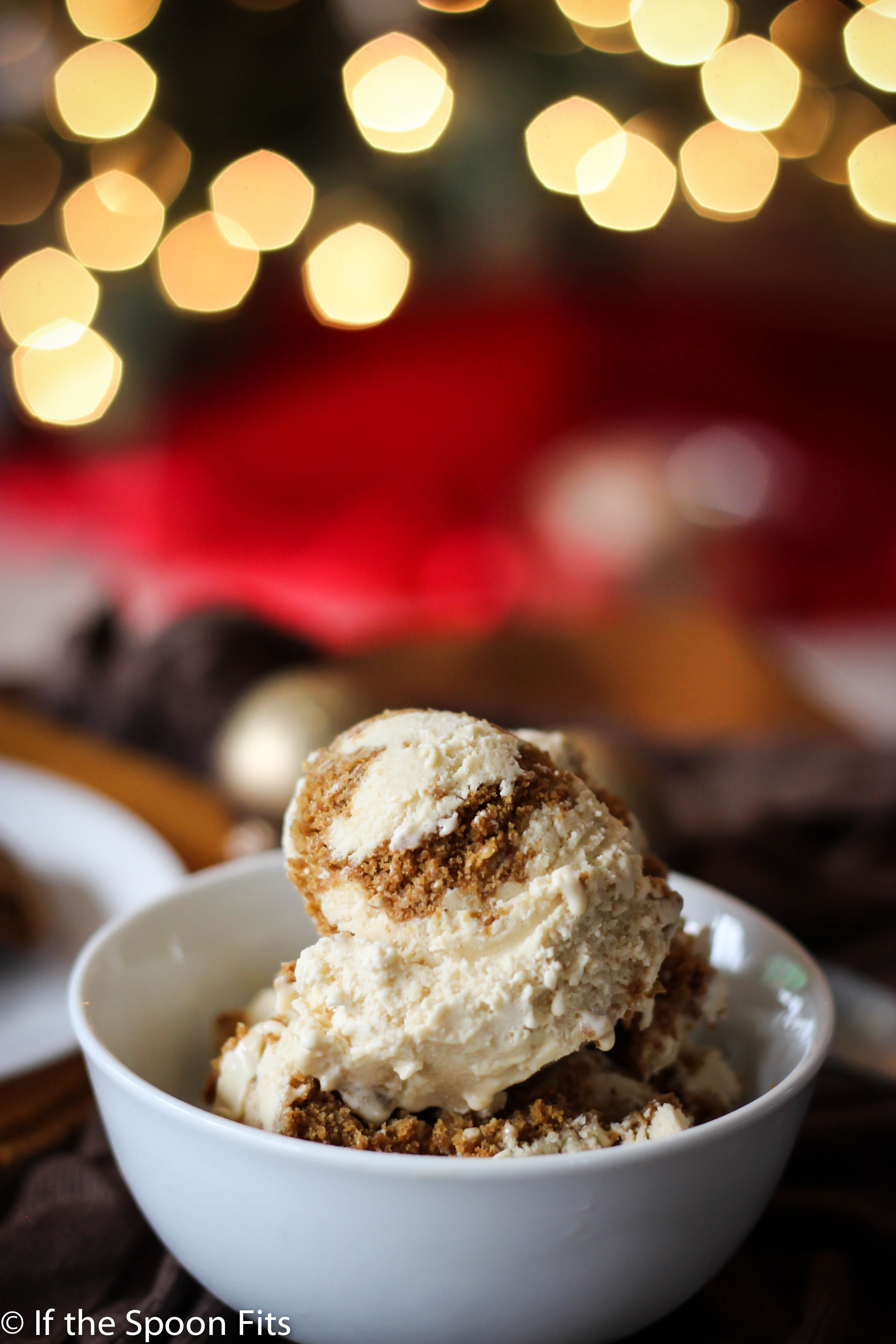 I used a soft gingerbread cookie recipe so that the swirl would retain some moisture and have a more flavorful finish. I baked a batch, and once they were cooled, I pulsed them in my blender until the crumb was uniform and smooth. Then I alternated layers of ice cream and packed cookie crumbs until I reached the top of my storage container. When scooped, it gives a cool swirly effect. As such: